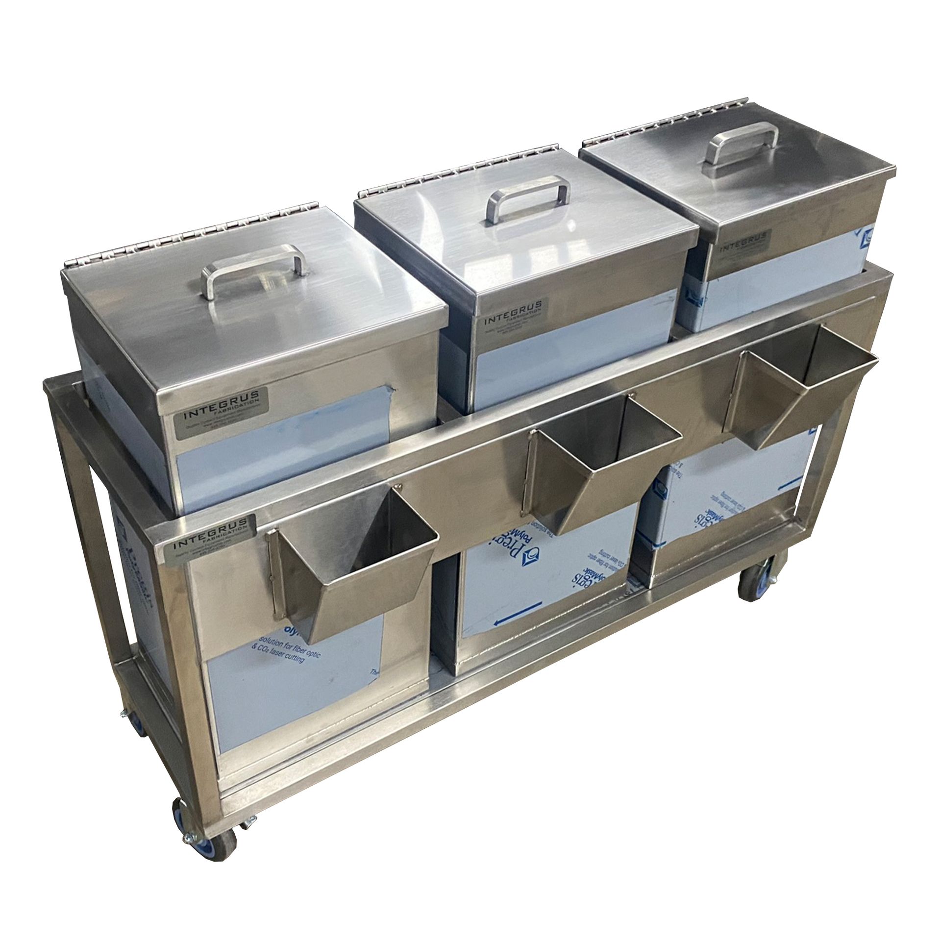 - (3) Removable Stainless Steel Bins that feature two handles for easy lifting